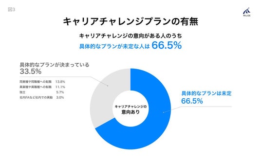 ■2.キャリアチャレンジ意向者のうち約67%が「具体的なプランは未定」と回答 他方、これからキャリアの転換期を迎える人たちに対する「今後、何らかのキャリアチャレンジをしたいと思っていますか?」という質問については、キャリアチャレンジの意向を示している人のうち、66.5%もの人が「具体的なプランは未定」と回答しました(【図3】参照)。