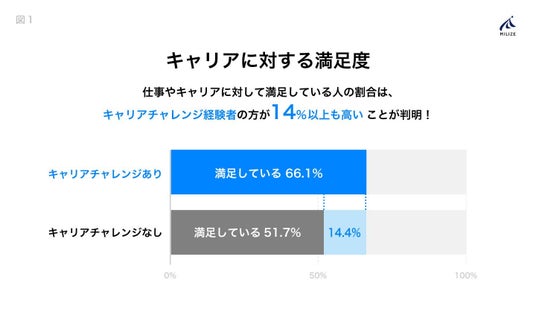 仕事・キャリアに対して満足している人の割合は、キャリアチャレンジ経験者が未経験者を14.4%も上回っています。