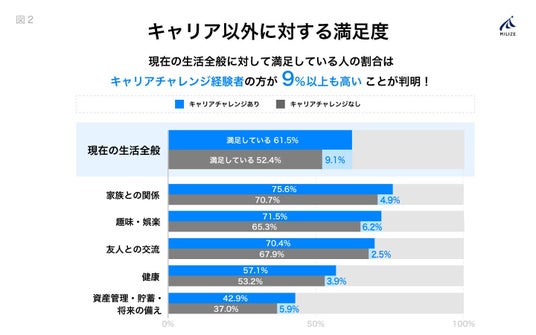この調査結果からは、キャリアチャレンジに積極的に取り組んだ人は、仕事・キャリアの面だけにとどまらず、日々の生活やプライベートについても高い充実感や満足感を得ていることがうかがえます。