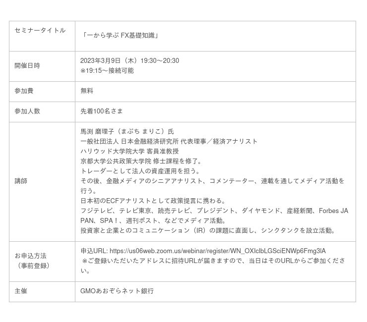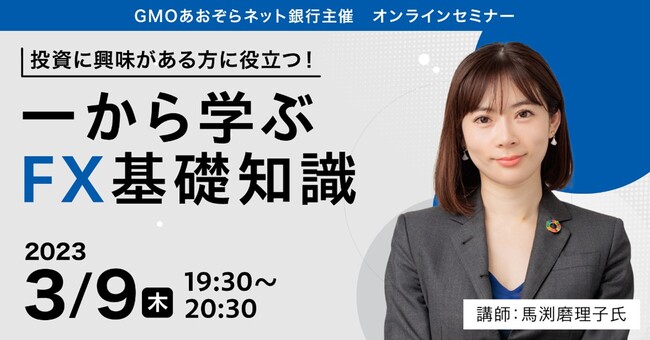 GMOあおぞらネット銀行株式会社(以下、当社)は、2023年3月9日(木)19:30より、テレビや雑誌、Webメディア等でもご活躍の人気経済アナリスト 馬渕 磨理子氏を講師にお迎えし、無料のオンラインセミナーを開催いたします。