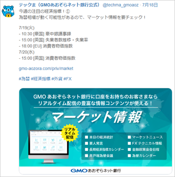 公式Twitter「テックま(@techma_gmoaoz)」で、注目の経済イベント情報を毎週月曜日の10時に配信しています。そのほか、インターネットバンキング上に豊富な情報コンテンツを用意していますので、お取引のご参考としてぜひご活用ください。
