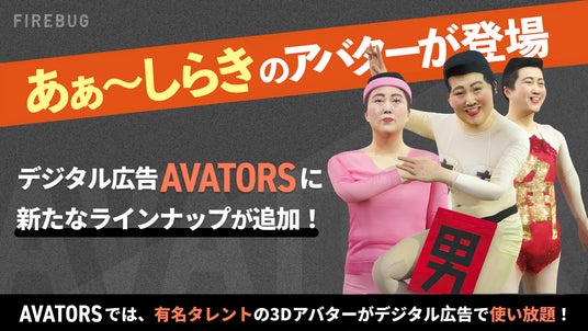 「タレント」を軸としたエンターテインメントを企業と共創する株式会社FIREBUG(本社:東京都渋谷区、代表取締役 CEO:佐藤詳悟 以下当社)は、2024年7月11日(木)より、人気タレントの3Dアバターを利用したクリエイティブ制作サービス「AVATORS(アバターズ)」に、『女芸人No.1決定戦 THE W』において、 2018年および2023年の決勝に進出した経験を有し、TVや各メディアでも活躍するあぁ~しらきを新たに追加します。今回のラインナップ追加により、「AVATORS」で使用できるタレント数は合計21組に拡充します。