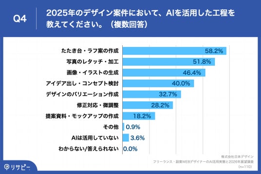 「Q4. 2025年のデザイン案件において、AIを活用した工程を教えてください。(複数回答)」(n=110)と質問したところ、