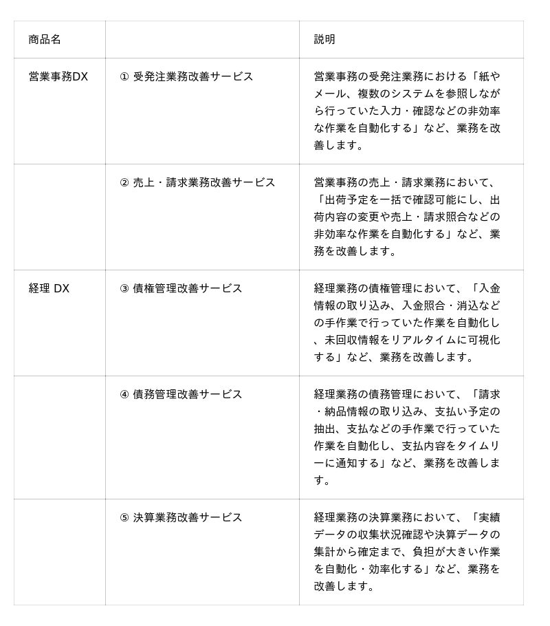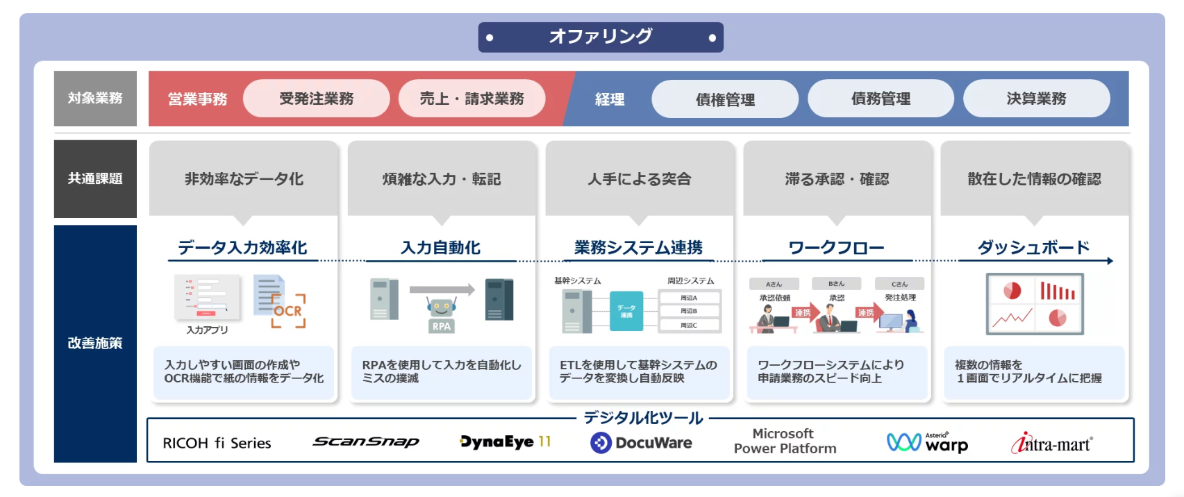 3.特長:オファリングによるスピーディーな業務改善バックオフィス業務の中でも特にアナログな非効率業務が多い営業事務(例:受発注、売上・請求業務)および経理業務(例:債権・債務管理、決算処理)を対象としています。