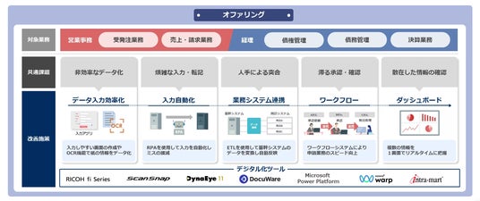 本サービスでは、営業事務の受発注および売上・請求業務、経理業務の債権・債務管理や決算処理を対象に、基幹システム周辺に散在する紙・メールなどに依存したアナログな非効率業務をデジタル化します。OCRによるデータ入力効率化やデータ連携による二重入力の排除、ワークフローによる業務標準化など、効果の高い改善施策をオファリングとしてまとめて提供することで、お客様が直面する課題をスピーディーに解決します。