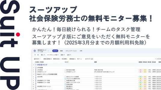 株式会社スーツ(所在地:東京都千代田区、代表取締役社長CEO:小松 裕介)は、チームでかんたん、毎日続けられるプロジェクト・タスク管理ツールの経営支援クラウド「Suit UP」(スーツアップ)において、社会保険労務士の無料モニターを募集いたします。