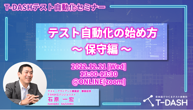 ソフトウェアのテスト・品質向上支援サービスを提供するバルテス株式会社(本社:大阪市西区、東京都千代田区、代表取締役社長:田中 真史)は、2022年12月21日(水)に、T-DASHテスト自動化セミナー「テスト自動化の始め方 ~保守編~」を開催いたします。