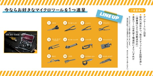 キャステムオリジナル商品の中でも大変好評をいただいているミニチュア工具シリーズの新作『MICRO TOOL SET』の中から1点を、弊社ブースで簡単なアンケートにお答えいただいた方にプレゼントいたします。