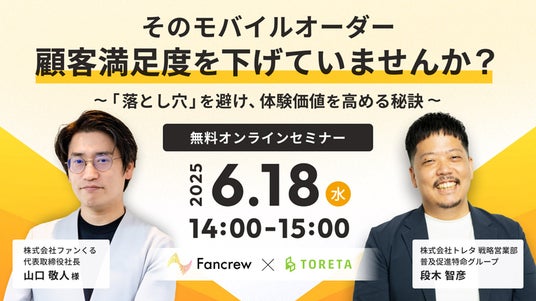 お客さまの声を最先端の分析でファン増加につなげる企業、株式会社ファンくる(本社:東京都千代田区 代表取締役社長:山口敬人)の山口社長が、2025年6月18日(水)に開催される株式会社トレタ主催「そのモバイルオーダー、顧客満足度を下げていませんか?~「落とし穴」を避け、体験価値を高める秘訣~」に登壇いたします。