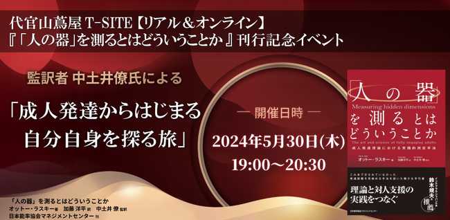 株式会社日本能率協会マネジメントセンター(代表取締役社長:張 士洛、東京都中央区、以下JMAM〔ジェイマム〕は、代官山 蔦屋書店と共催し、2024年5月30日(木)19:00より、代官山 蔦屋書店にて『「人の器」を測るとはどういうことか』刊行記念イベント 監訳者 中土井僚氏による「成人発達からはじまる自分自身を探る旅」を開催いたします。