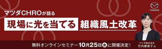 講演では、ひとを中心とした人材育成施策や、社会における存在意義の全社員浸透、その実現に向けた経営層が発揮すべきリーダーシップなど、「心を動かす」という価値に基づいて推進されている組織風土改革の事例と変化の兆し、そしてマツダが目指す将来への展望をお話しいただきます。