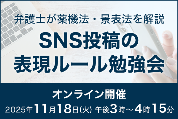 本勉強会では、広告規制を専門にする齋藤健一郎弁護士を講師にお招きし、薬機法・景品表示法の基礎を分かりやすく解説していただき、SNSやアフィリエイト投稿で注意すべき表現とその対応方法を学ぶことができます。