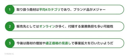 - 取り扱う商材は平均4カテゴリであり、ブランド品がメジャー