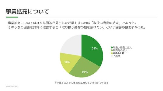 「今後どのように事業を拡充していきたいですか」(複数回答)という質問に対して、最多の回答は33%の「取扱い商品の拡大」であった。中でも取り扱い商材の幅を広げたいという回答が多かった。