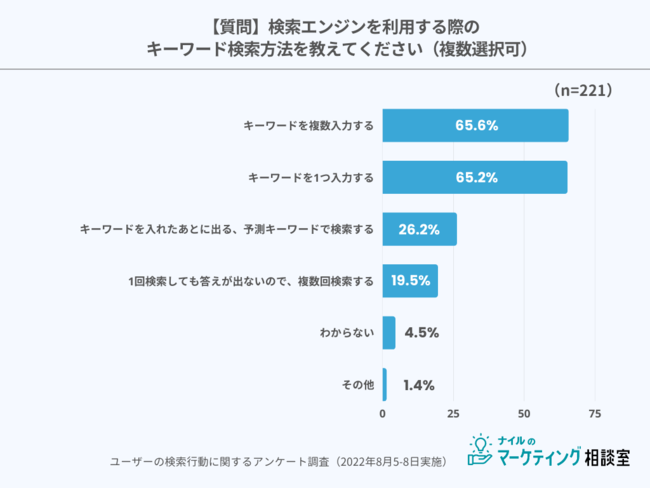 検索エンジン(Google、Yahoo!など)を利用して調べものをする男女221名のうち、キーワードの検索方法として最も多かったのは「キーワードを複数入力する(65.6%)」、次いで「キーワードを1つ入力する(65.2%)」と回答しました。