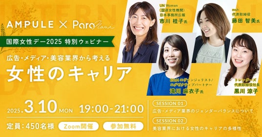その一環として「国際女性デー2025特別ウェビナー 広告・メディア・美容業界から考える女性のキャリア」を3月10日(月)に開催いたします。本ウェビナーは、当社が運営する美容特化型イノベーションファーム「ampule」と、女性向けパラレルキャリア支援サービス「Paranavi」による共同主催ウェビナーです。