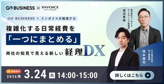 この度、株式会社インボイス(代表取締役社長:仁多見 斎 本社:東京都千代田区)は、GO株式会社(代表取締役社長:中島 宏 本社:東京都港区)と、【GO BUSINESS × インボイスが提案する 複雑化する日常経費を「一つにまとめる」両社の知見で見える新しい経理DX】 というテーマで共催セミナーを開催致します。