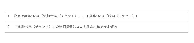 今後の物価指数の推移を見守る必要がある前提にはなりますが、現在は2018年1月の基準値で安定傾向にあることから、落語、サーカス、演劇などのエンターテイメントに対する需要がコロナ前の水準に戻ってきていることが考えられます。