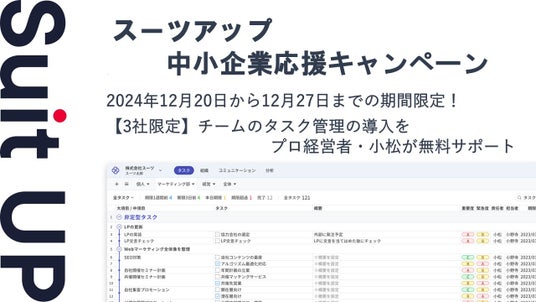2024年12月20日から12月27日までの期間に、スーツアップの無料お試し30日にお申込みいただきました、前月末時点で社歴50年以上100年以下の中小企業うち3社限定で、当社代表者であり中小・中堅企業やスタートアップのバリューアップに実績のあるプロ経営者の小松自ら、チームのタスク管理の導入サポートを無料で行うキャンペーンを実施します。