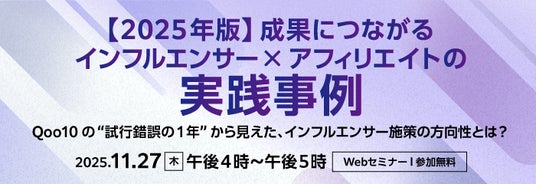 バリューコマース株式会社(本社:東京都千代田区、代表取締役社長 最高経営責任者:香川 仁)は、インフルエンサー施策とアフィリエイトを融合した最新事例を紹介する無料オンラインセミナーを2025年11月27日(木)に開催いたします。