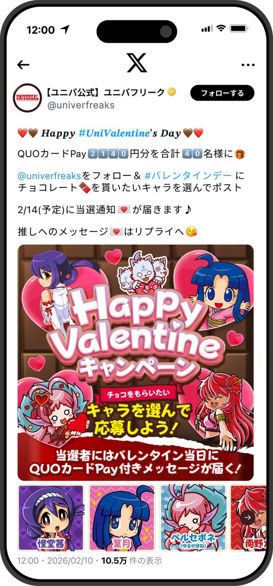 ユーザーはチョコを貰いたいキャラクターの名前を投稿して参加し、当選結果は2月14日のバレンタインデーに通知されます。単なる当選連絡ではなく「推しからメッセージが届く」演出にすることで特別感を高め、参加意欲や話題化を狙いました。