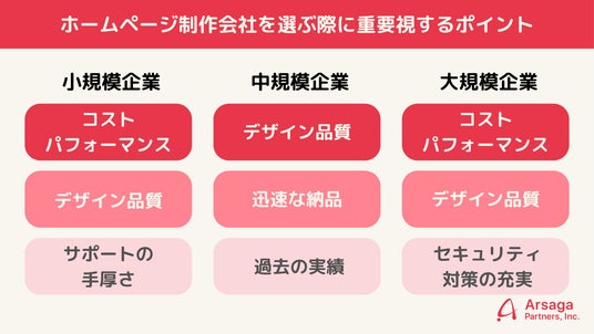 - ホームページ制作会社選定で、小規模は「コスパ」、中規模は「デザイン」重視