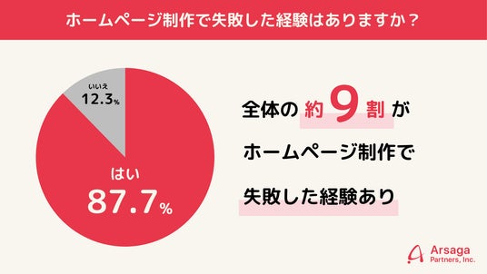 企業のDXを促進するアルサーガパートナーズ株式会社(本社:東京都渋谷区、代表取締役社長 CEO/CTO:小俣泰明、以下「アルサーガパートナーズ」)は、ホームページ制作を経験したことがある企業の担当者およびホームページ制作会社へ発注経験のある550名を対象に、ホームページ制作に関する実態調査を行いました。調査の結果、約9割がホームページ制作の外注で失敗経験があることが明らかになりました。