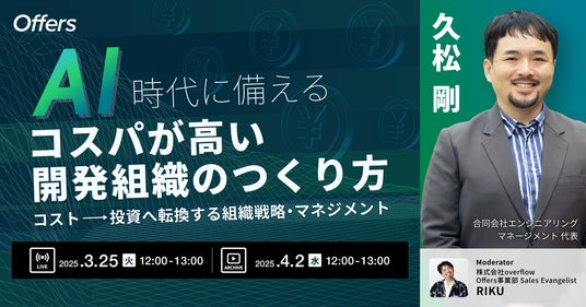 「AI時代に備える『コスパが高い開発組織のつくり方』~コスト→投資へ転換する組織戦略・マネジメント~」を2025年3月25日(火)にライブ配信、4月2日(水)にアーカイブ配信します。