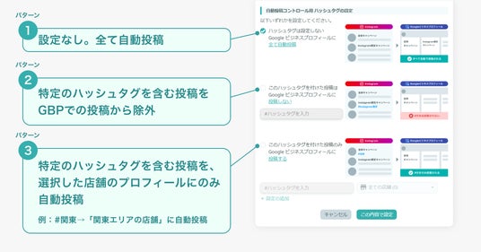 これまでは、GBPへの自動投稿の有り無しのみの選択が可能でした。今回の新機能リリースで、ハッシュタグ毎に自動投稿する先のGBPを設定することができます。
