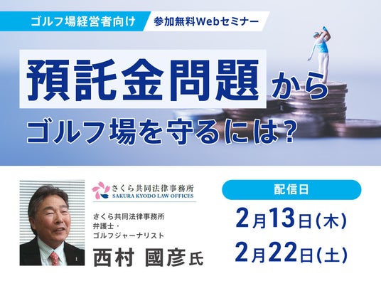 株式会社ストライク(東京都千代田区、代表取締役社長:荒井邦彦)は、2月13日(木)、22日(土)にさくら共同法律事務所の弁護士・ゴルフジャーナリストである西村國彦氏と共にゴルフ場経営者向けのセミナー『預託金問題からゴルフ場を守るには?』を開催いたします。