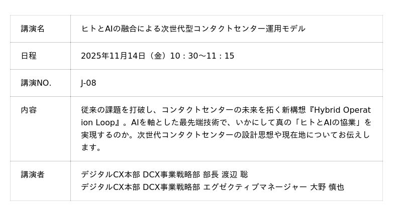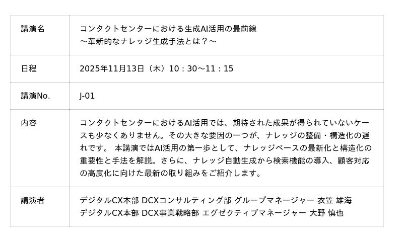 さらに、当社のコンサルタントやエンジニアによるセミナーでは、コンタクトセンターにおける生成AI活用や自動化の最新動向、CX成功のカギについて詳しく掘り下げます。