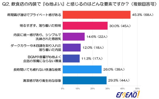 最も多かったのは「席間隔が適切でプライベート感がある」(45.3%・68人)で、約半数の人が周囲を気にせず過ごせる空間づくりを重視していることが分かります。