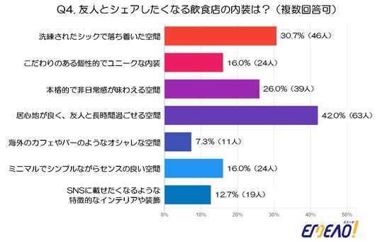 - さらに、「友人とシェアしたくなる飲食店」についても、“居心地の良さ”や“特別感”が上位となり、個性的な装飾やSNS映えよりも、