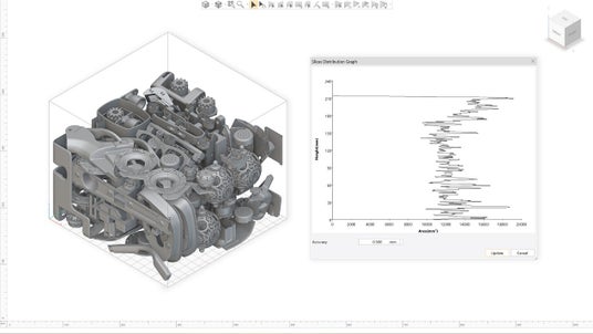 最適な造形のためには、レイヤーごとにスキャン表面積が比較的一定であることが望まれます。プラットフォームのスライス分布グラフを確認すると、より一貫した破線はより理想的な造形を示します。スライス分布を最適化すると印刷品質が向上します。