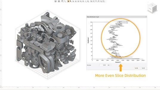 スライス分布も SLSプリントでは非常に重要です。スライス領域(焼結面積)が均等に分散されているということは、熱が均等に分散されているということであり、印刷品質が向上します。