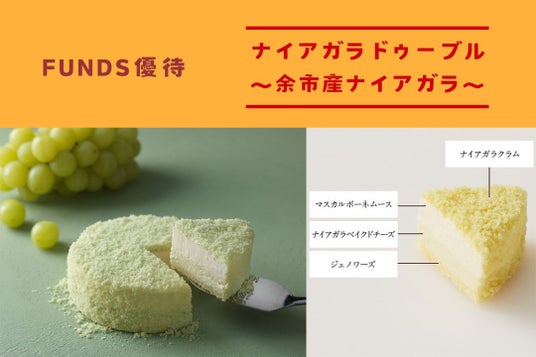 甘みがあり芳香豊かなナイアガラ葡萄を使用したドゥーブルフロマージュ。 ベイクド層にナイアガラジュースを加えブドウの甘み広がる味わいに。レアチーズムースはイタリア産マスカルポーネでミルク感あふれる味わい。ナイアガラの甘みと香りが、マスカルポーネや生クリームなどのミルクのまろやかさと相性がよく、また食べたくなる一品です(小樽洋菓子舗ルタオHPより一部引用)。