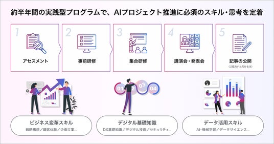 2024年8月下旬から約半年間に渡って実践型人材育成プログラムを提供し、受講者にAIプロジェクト推進に必須のスキル・思考を定着させます。