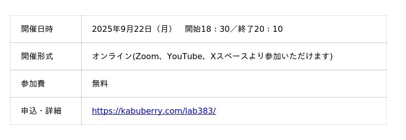 株式会社NEXYZ.Group(本社:東京都渋谷区、代表取締役社長 兼 グループ代表:近藤太香巳、証券コード:4346)は、2025年9月22日(月)に開催される「Kabu Berry Lab NEXYZ.Group (4346) IRセミナー」に登壇いたします。