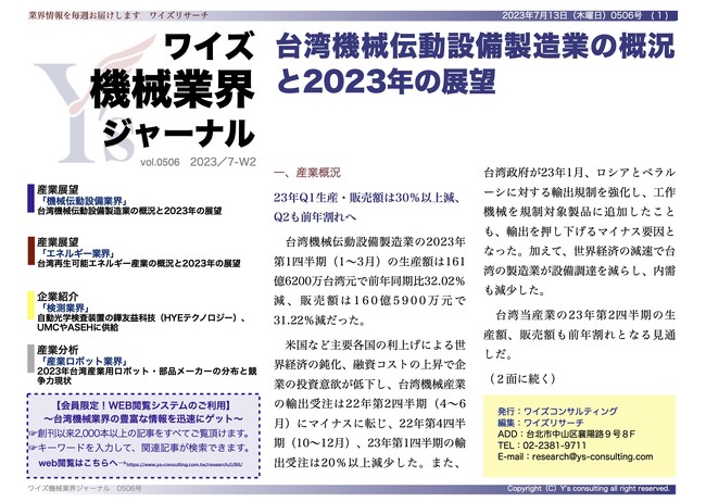 ワイズコンサルティング グループ(本社:中華民国台北市、代表取締役:吉本康志)は台湾機械業界専門誌「ワイズ機械業界ジャーナル」の2023年7月第2週号を発行しました。今週号では機械伝動設備業界、エネルギー業界、検測業界、産業ロボット業界の動向を紹介します。