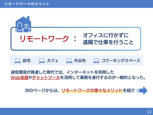 インターネットを利用したWeb会議やチャットツールの普及により、場所に縛られずに業務を進めることが可能となり、現代では広く普及しています。リモートワークには、