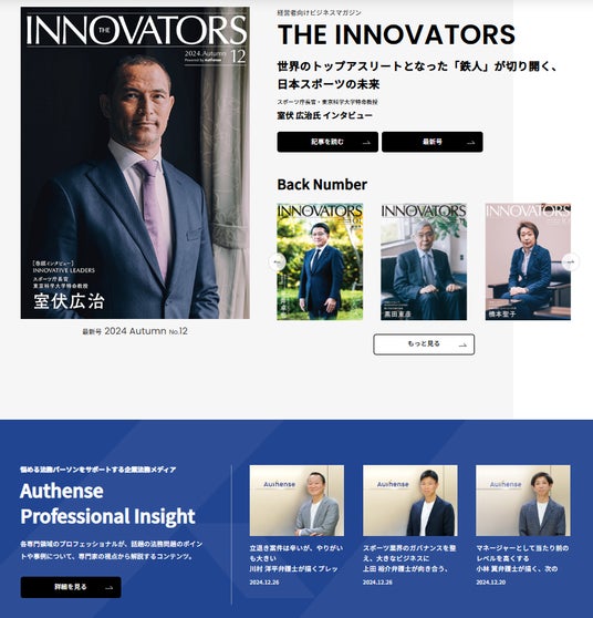 3.最新情報を発信経営者向けビジネスマガジン「THE INNOVATORS」や、法務情報・専門家の視点などをまとめたメディア「Authense Professional Insight」をページ内に配置。最新の法改正や実務のヒントを発信し、ビジネスを支える情報基盤としてご活用いただけます。