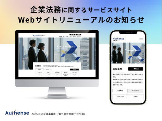 Authense法律事務所(東京都 港区)は、2025年2月に、企業法務に関するサービスサイトをリニューアルいたしました。今回のサイト刷新は、Authenseが昨年制定したブランドスローガン「Focus on Emotions(人の気持ちに、フォーカスする。)」を体現するものです。単なる情報提供ではなく、企業の皆さまや法務担当者の「感情」に寄り添ったサポートを続けていきたいという思いを反映し、視認性を向上させるとともに、各種コンテンツへのアクセスがスムーズになるようサイトの構成を見直しました。