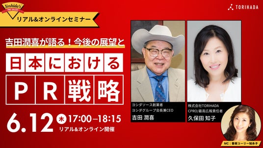 株式会社TORIHADA(本社:東京都渋谷区、代表取締役社長:若井 映亮)は、ヨシダソース創業者でありヨシダグループ会長兼CEOの吉田潤喜氏をお招きし、特別セミナー『吉田潤喜が語る!今後の展望と日本におけるPR戦略』を2025年6月12日(木)に開催いたします。