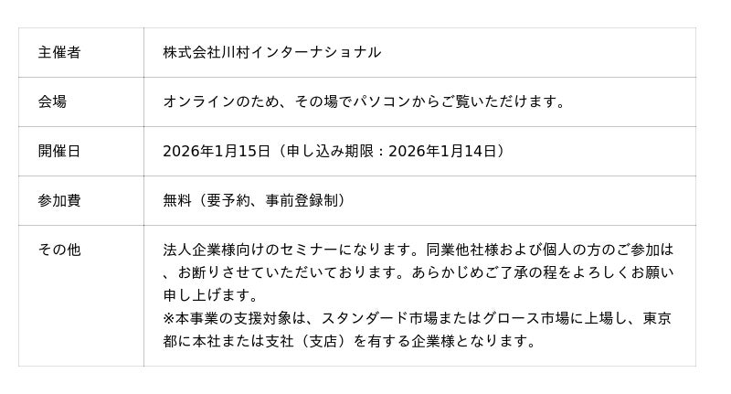 株式会社川村インターナショナル株式会社川村インターナショナル(代表取締役:森口 功造)は、2026年1月15日(木)に、AI自動翻訳システムを活用した英文情報開示支援事業についての無料オンラインセミナーを開催いたします。