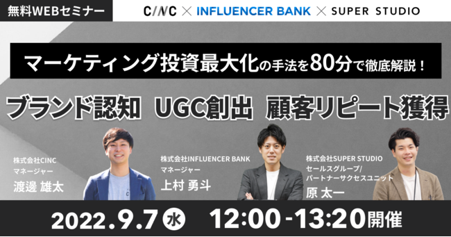株式会社CINC(シンク、以下CINC)は、2022年9月7日(水)に株式会社SUPER STUDIO、株式会社INFLUENCER BANKとオンラインセミナー『【マーケティング投資最大化の手法を80分で徹底解説!】 ブランド認知・UGC創出・顧客リピート獲得』を開催いたします。