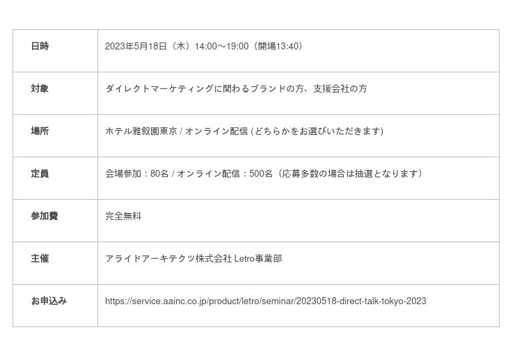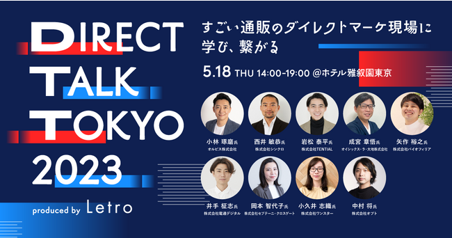 企業のマーケティングDXを支援するアライドアーキテクツ株式会社(東京都渋谷区、代表取締役社長 CEO:中村壮秀、証券コード:6081)でSaaS事業を展開するプロダクトカンパニー(プレジデント:村岡弥真人)が提供する運用型UGC(※1)ソリューション「Letro(レトロ)」は、通販のダイレクトマーケティングの担当者・パートナーを対象とした完全無料の大型イベント「Direct Talk Tokyo 2023」を5月18日(木)に開催いたします。