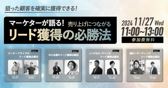 リード獲得から受注最大化までの実践的な戦略を提供するウェビナーを開催いたします。本ウェビナーには、社長から部長クラスのマーケティング責任者が登壇し、SEO、広告運用、SNS運用など幅広いジャンルにおける最新のノウハウを網羅します。具体的な戦略や成功事例をパネルディスカッション形式で共有し、ターゲット顧客獲得に向けた実践的なヒントを提供します。