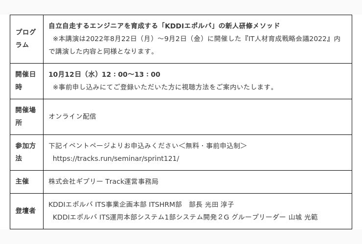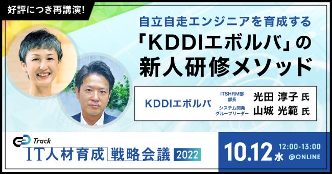 株式会社KDDIエボルバ(本社:東京都新宿区、代表取締役社長:若槻肇、以下KDDIエボルバ)は、株式会社ギブリー(本社:東京都渋谷区、代表取締役社長:井手 高志、以下ギブリー)が主催するオンラインカンファレンス「IT人材育成戦略会議2022」で好評をいただいた講演を10月12日(水)開催の「AgileHR day」で再講演いたします。次世代を担うIT人材育成の先進企業として、“自立自走エンジニアを育成する新人エンジニア研修の取組み”についてお話いたします。