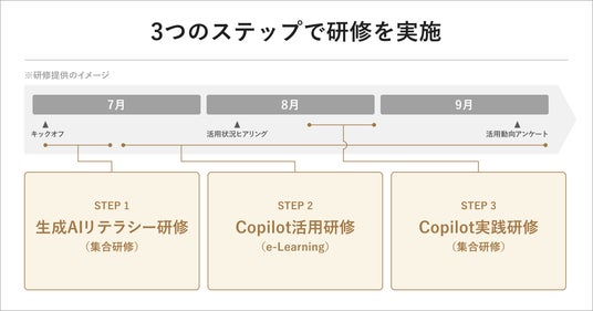 「生成AIリテラシー研修」「Microsoft Copilot活用研修」「Microsoft Copilot実践研修」の3つのステップに分けて研修を提案しました。