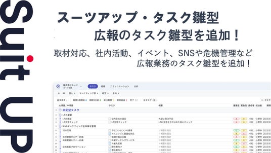 株式会社スーツ(所在地:東京都千代田区、代表取締役社長CEO:小松 裕介)は、チームでかんたん、毎日続けられるプロジェクト・タスク管理ツールの経営支援クラウド「Suit UP」(スーツアップ)に広報のタスク雛型を追加したことをお知らせします。